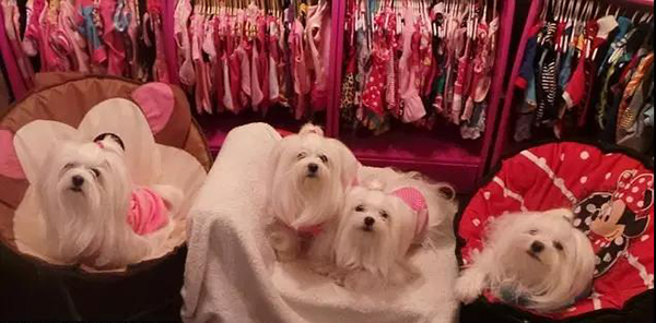 如今,Fiona的狗狗们有一系列的手工礼服,还有夹克、T恤,防水服等各式各样的宠物衣服。这些狗狗一共有六个衣柜,其中两个专门放圣诞节和万圣节的服装,也有自己的更衣室。Fiona说:“无论衬衫、毛衣,还是大衣和睡衣,甚至圣诞礼服,都是特殊定制从美国寄回来的。”
